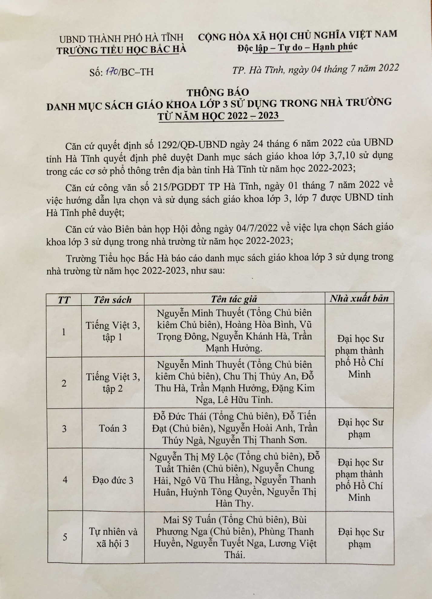 Căn cứ biên bản họp hội đồng lựa chọn sách giáo khoa lớp 5 năm học 2024- 2025 ngày 12/4/2024 của trường tiểu học Bắc Hà;